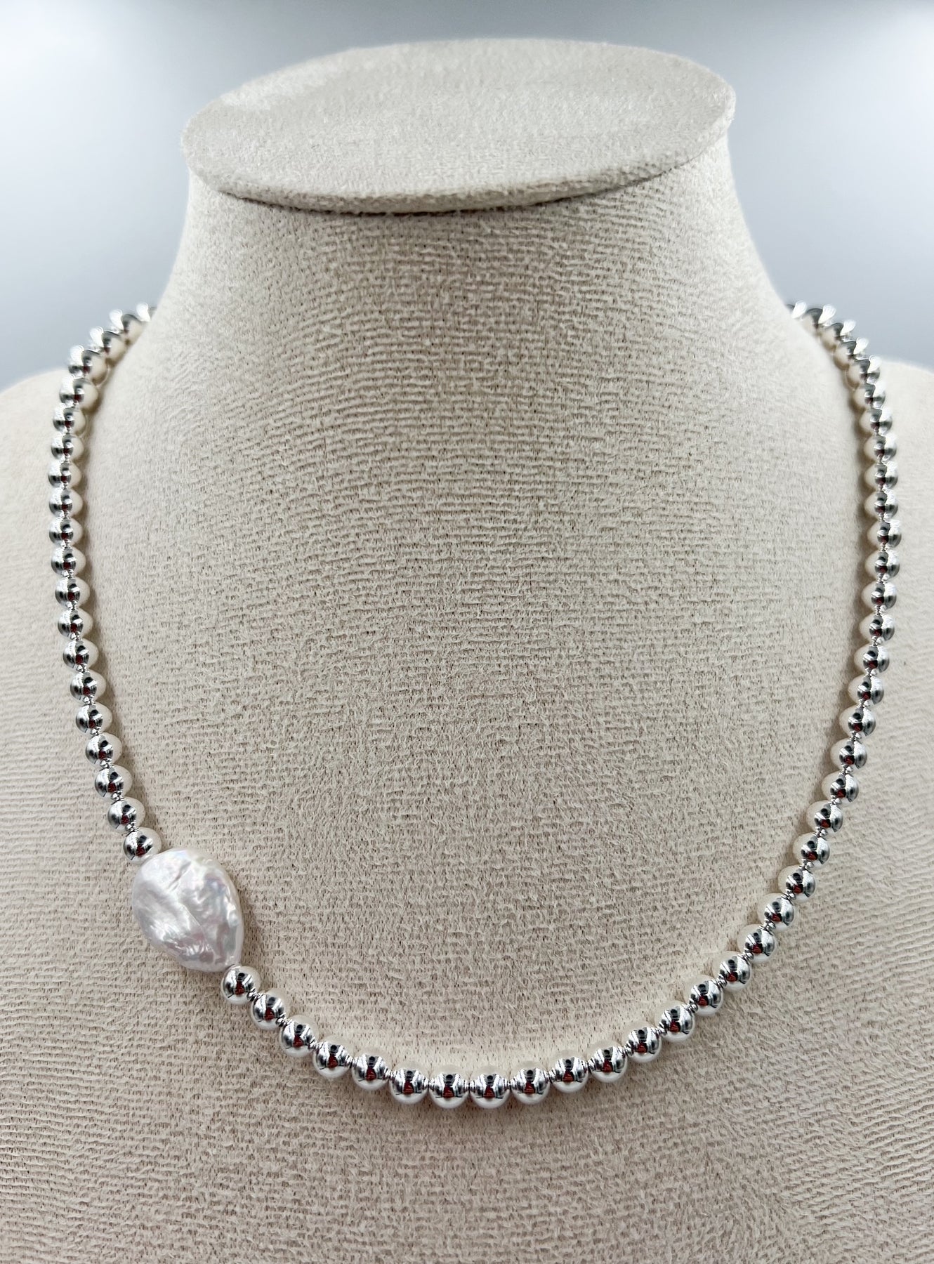 The most gorgeous statement necklace perfect for festive dinner or cocktails, parties or simply wear with denim, a crisp white shirt and blazer for a cool vibe. 6/5mm sterling silver or 14k gold filled beads with a freshwater baroque pearl off-centre for a little of the unexpected. 16" length, message for other size info.