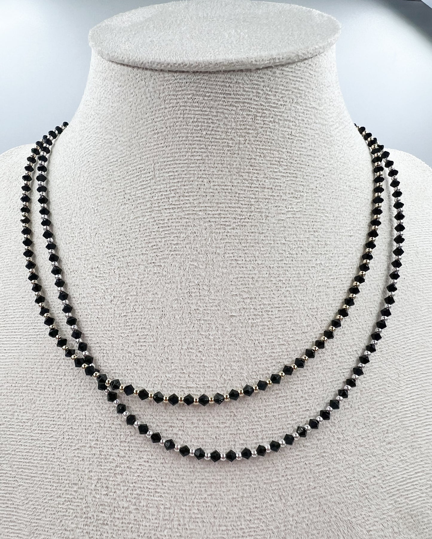 2mm 14k gold filled or sterling silver beads in a repeating pattern with black bicone crystals 16” in length