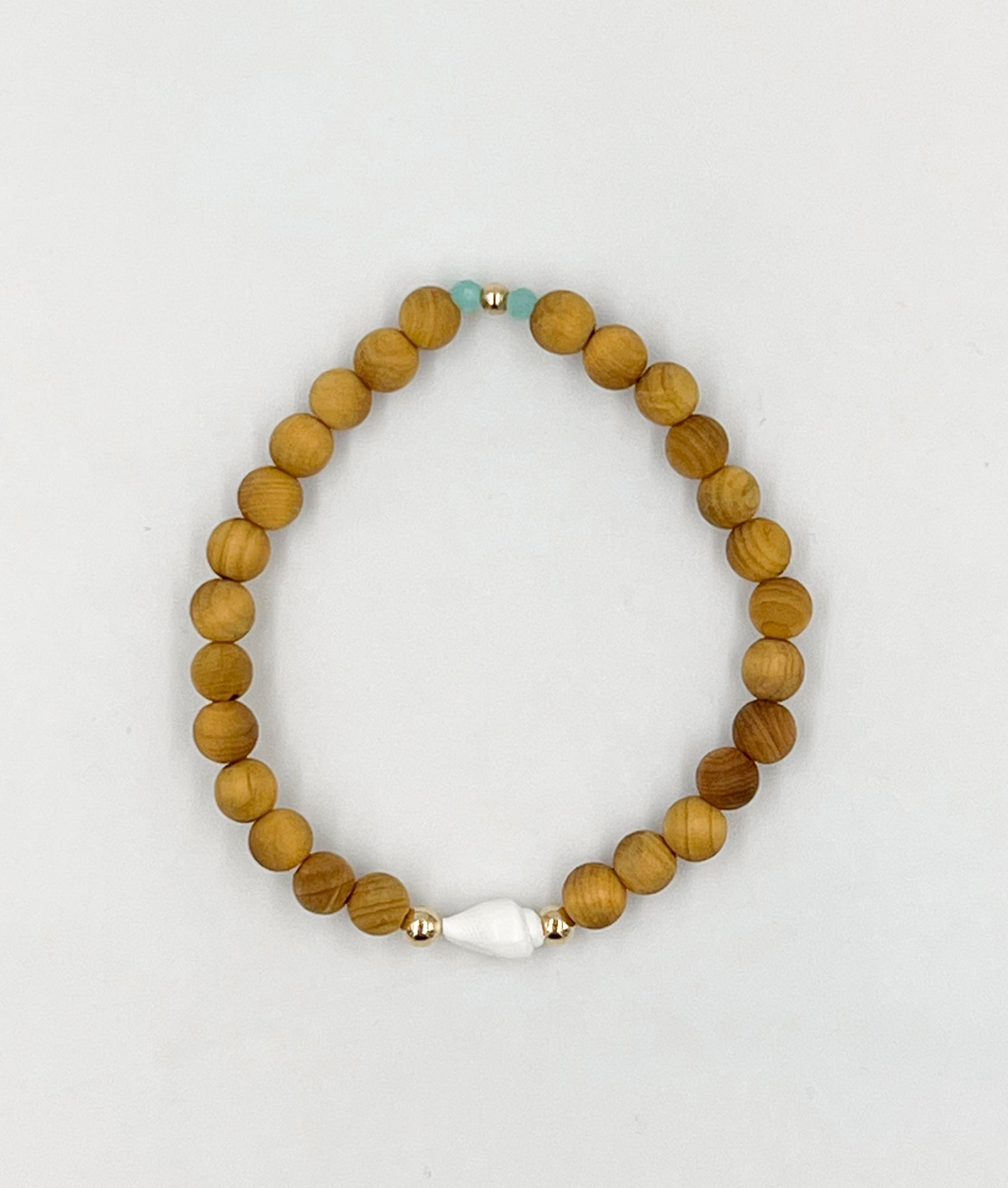 6mm fragrant sandalwood beads with gold or silver accents and a tiny seashell. Beautiful and beachy. Approximately 6 3/4-7”.