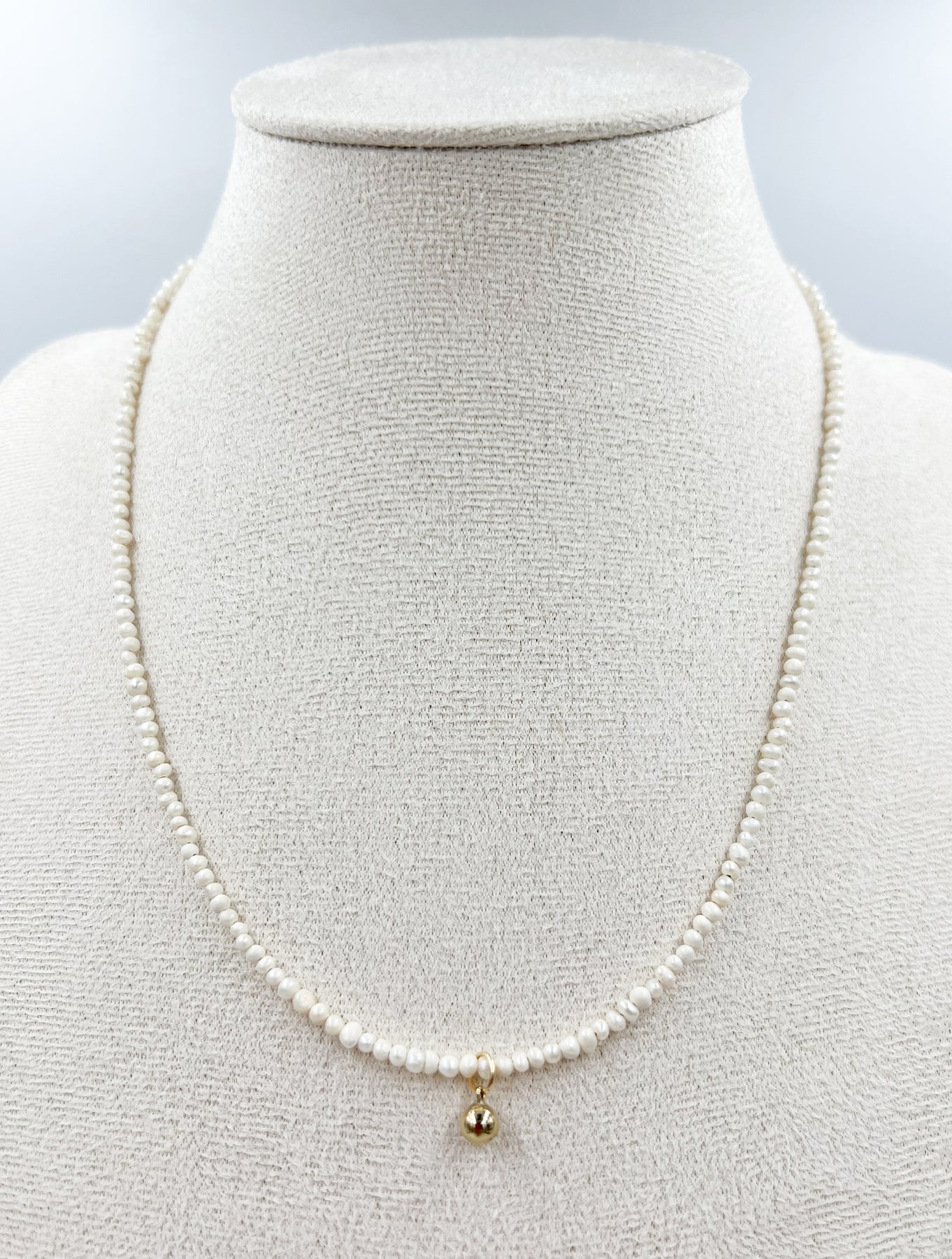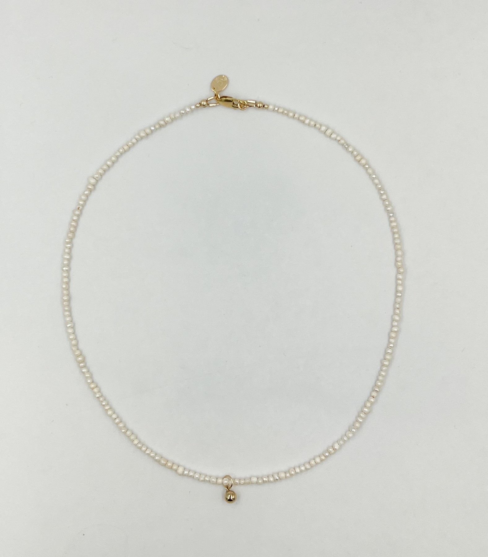 Tibet 2mm freshwater pearl beads with 14k gold filled bead ball drop charm. 16” length.