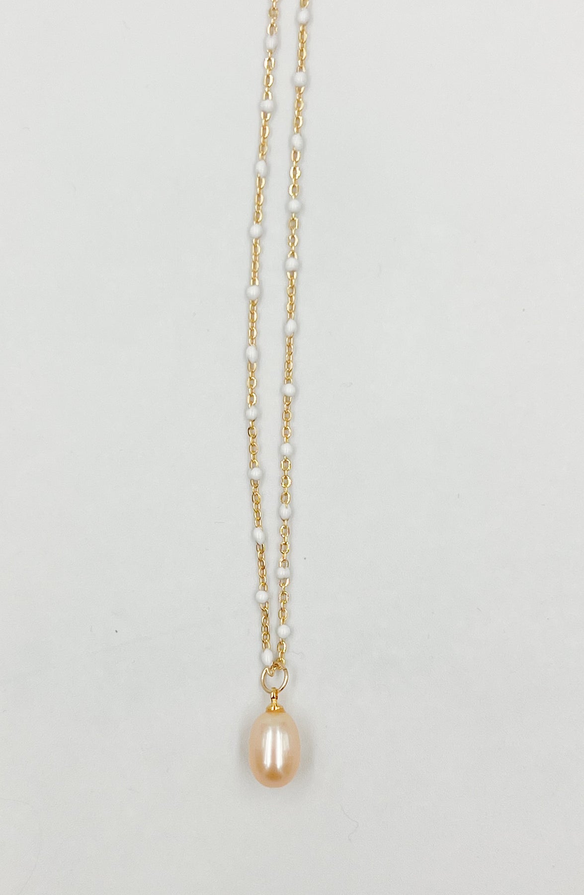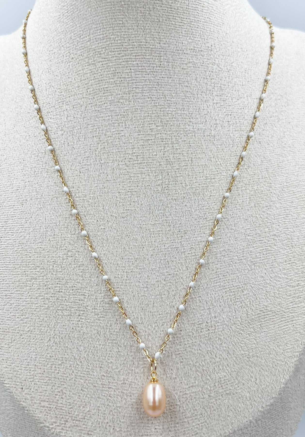 A freshwater peach pearl pendant drop strung on 14k gold filled and white enamel necklace with extender. 16-18” length.